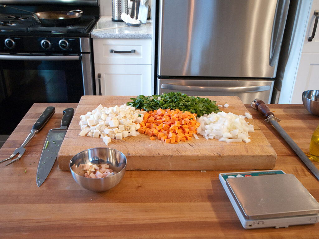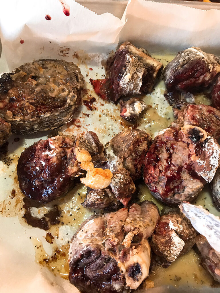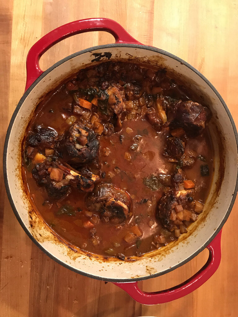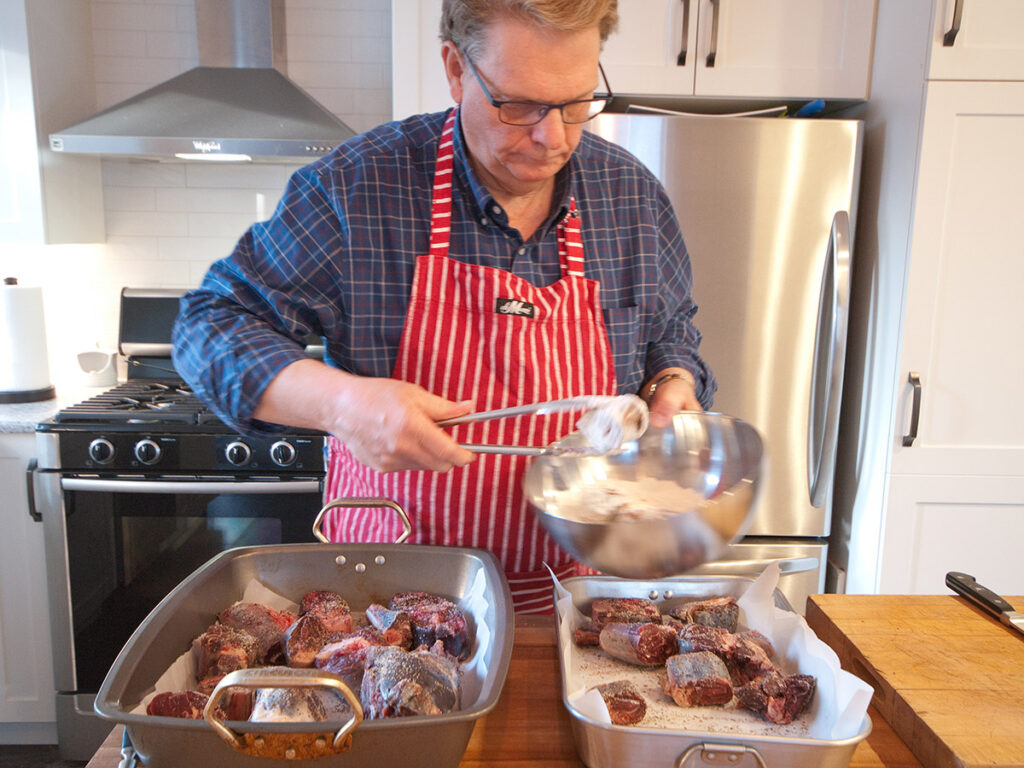 MR: I’ve always told people that if you want, you can salt your meats as soon as you bring it in the back door. If you salt just before you flour the meat, you can lose some salt. I like to salt at least 30 minutes to 60 minutes (or more) before cooking the meat. Braising allows you to take pleasure in the cooking, slow down, and salt your meat well in advance so that the salt gets absorbed. Pepper is always good on beef, then dust in flour. When that floured meat hits hot fat, that beautiful aroma of browning flour and beef is something I appreciate. That’s part of the reason that I like to braise, because it gives me that sensory pleasure when I’m cooking food, floured meat, and hot fat.
