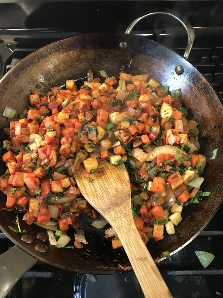 Then, you remove the seared meat from the pot, and you clean out your pot. Usually, you’ll need to rinse out your pot because the flour that remains burns, and you don’t want that burned flavor in there. Then, you will add your wine. You can start adding your vegetables if you want, if you’re going to cook with vegetables. You would stir in some vegetables; you’ll sauté them so that they develop more flavor — sweet vegetables like carrot and onion. You could sweat those, and then you would add the meat back into the pot, and then you would add your braising liquid, whether it’s stock or tomato.