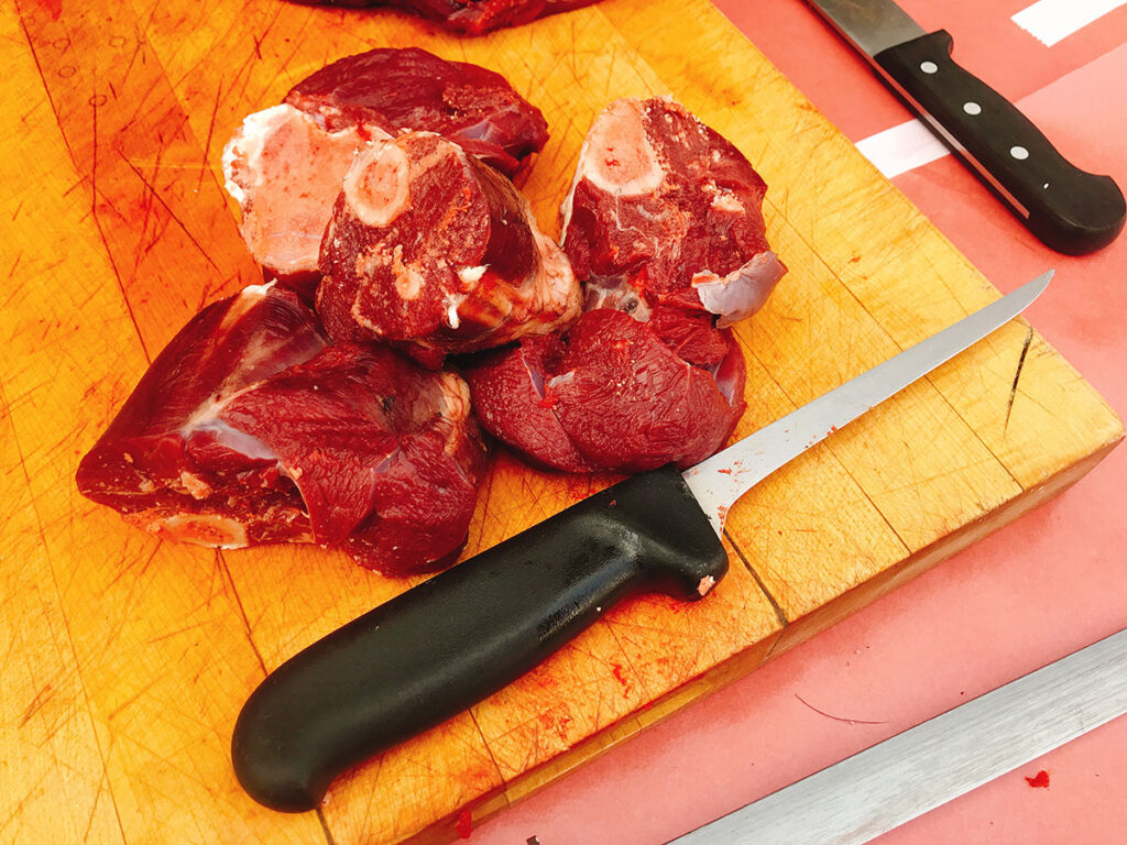 Whatever that liquid needs to be liquid, what will break down the collagen, which is the connective tissue in these tough pieces of meat. A shank that has been well worked-in is full of collagen and in the joints as well. Cartilage is collagen, skin is collagen, and all the connective tissue within the muscles holds these muscles and works muscles together. All that’s collagen, and it needs to melt. It can’t melt in a dry environment and needs (braising) liquid. When it melts, it turns into gelatin, a protein that enriches our sauce and gives it more body.