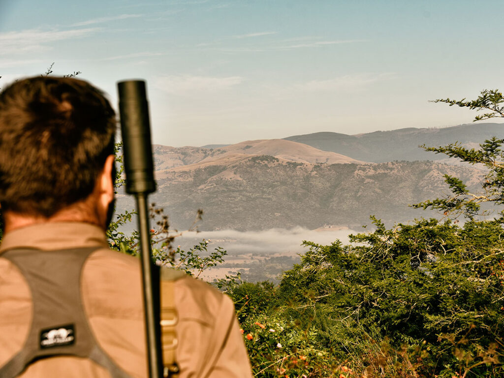With mist swirling in the valleys and coffee sloshing in our guts, we jumped on board a Land Cruiser and attempted to locate the herd. After a couple of hours of glassing and moving, we eventually spotted a small group of cows and calves tucked under some acacia trees in the bottom of a valley. With the sun now out in full force despite the late fall temperatures, the buff had decided to seek a little shade, their enormous hides soaking up the rays and making things uncomfortable when out in the open. Staying on the valley’s side slope above them to keep our scent out of their nostrils, we stalked closer, dropping into a crouch and then a low crawl as we came up on the smallest of ridges. Our crew consisted of Matt, the PH for the day, Thabo our tracker, me, and Colton, a buddy from Utah who also guided professionally on one of the biggest ranches in the U.S. I brought up the rear, as we’d already decided that Colton would take the first shot.
