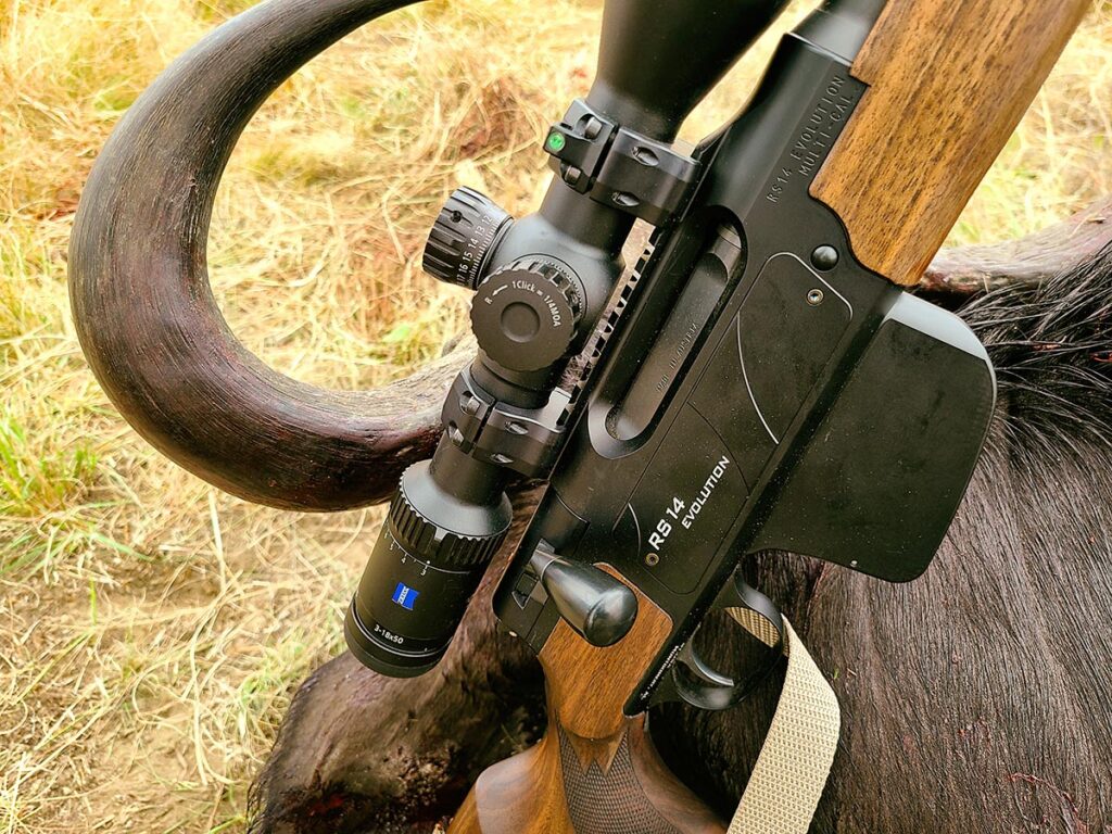 The Zeiss V8 1-8×30 scope mounted on the rifle was equally as versatile. Dialed down to 1x, it provided a wide, flat field of view with a daylight visible center dot ideal for the dangerous game part of the adventure, while the 8 power top end allowed easy hits out to 350 yards on spiral horned species.