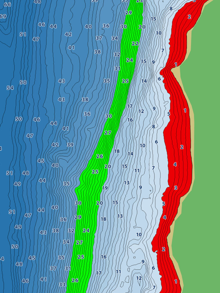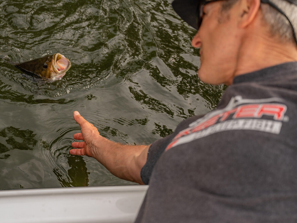 In windier conditions, drifting and fishing the Carolina rig gives a natural presentation while covering water. Boat control is key, but less is more: the boat just needs to stay in the correct depth, often along a contour line – covering water is the goal versus fishing a single spot. The bait moves faster, the weight makes more noise, and the bottom stirs up. The bait’s action draws reaction strikes that are vicious and easy to detect.