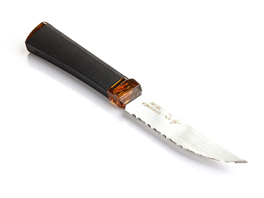 Ontario Knife makes a few steak knives; this four-piece set is part of their Agilite line of kitchen knives, which includes a chef knife, paring knife, and others. The Agilite steak knife’s thin, full-tang blade has a flat spine with a slight belly and a wide curve to the point. It’s serrated with wide scallops and teeth. The handle is comprised of hard polycarbonate that looks like amber fossil resin from the Jurassic era and tacky VersaFlex for a secure grip. Made in the USA.
