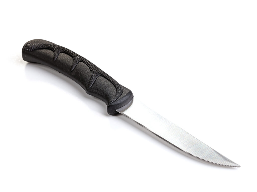 Outdoor Edge’s WildGame steak knives are very affordable. The taper ground blade has a lightly upswept tip, with micro-serrations across its entire length. The polypropylene handles are contoured for a comfortable grip with a molded elk antler texture to prevent slipping. Comes in a pack of four and available in black or orange. Made in China.