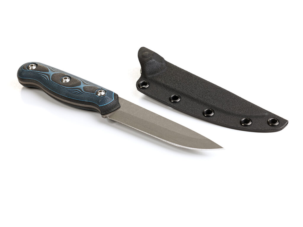 A tactical knife company, TOPS Knives has a line of kitchen knives made with the same types of materials they use for their hard-use tactical knives. They boast premium CPM S35VN steel, a matte tumble finish, and two-toned G10 scales. The heavy full-tang knife has an extremely stout drop-point blade and a chunky handle, along with a matching black Kydex sheath. Made in the USA.