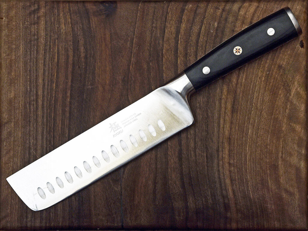 Nakiri hˉochˉo or Usuba hˉochˉo refer to vegetable knives. These knives lack a tip and look like a cleaver or straight razor in shape. The Nakiri has a V-grind like the Santoku, but the Usuba is chisel ground. The lack of a tip allegedly goes back to a time when a samurai of high rank took offense to a cook pointing a blade at him while he was preparing the samurai’s dinner and knives such as these were then made without a pointed tip.