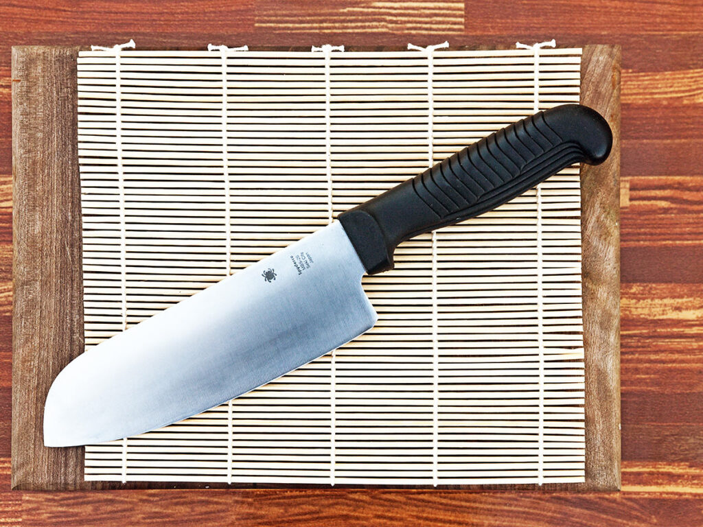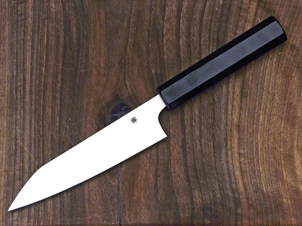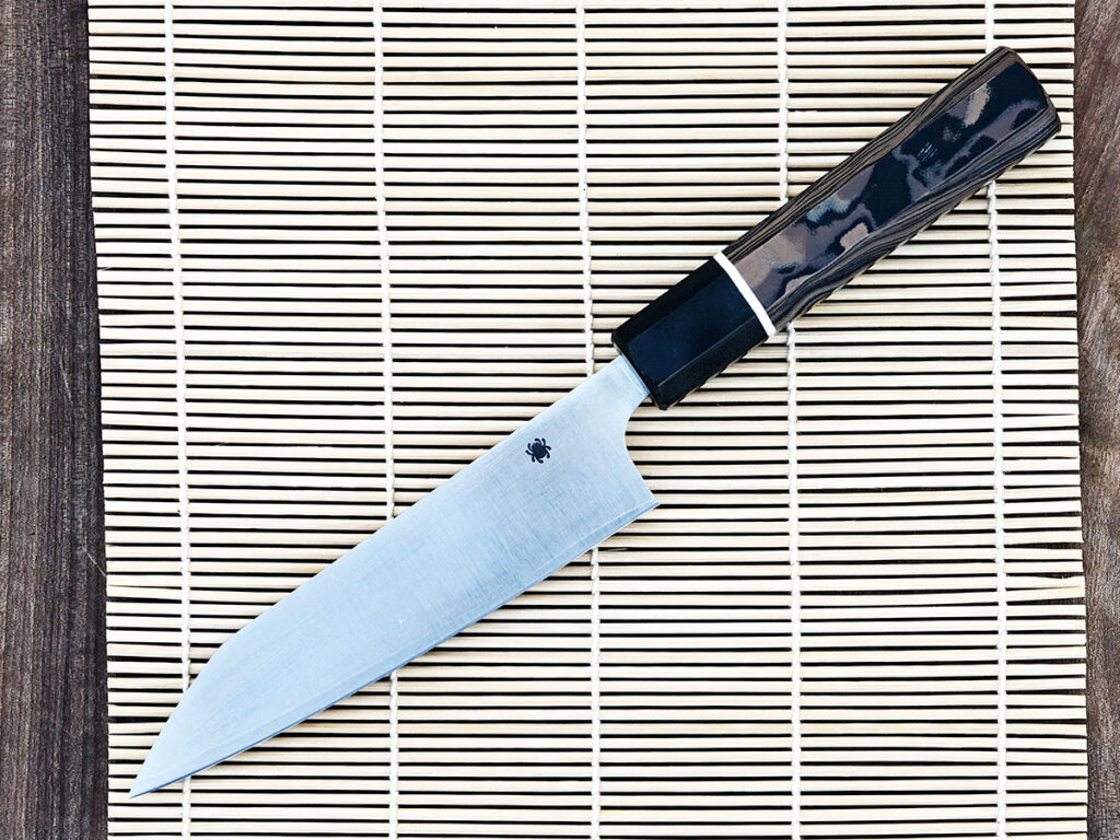 VG10 is a stainless steel made in Seki City, Japan, specifically for Japanese-style kitchen knives. It has all the right properties for a kitchen knife — sharpness, hardness, edge retention — and offers a good degree of corrosion resistance. Spyderco Knives makes some outstanding examples in Japan, including a series by Muteki Bladesmith Murray Carter.