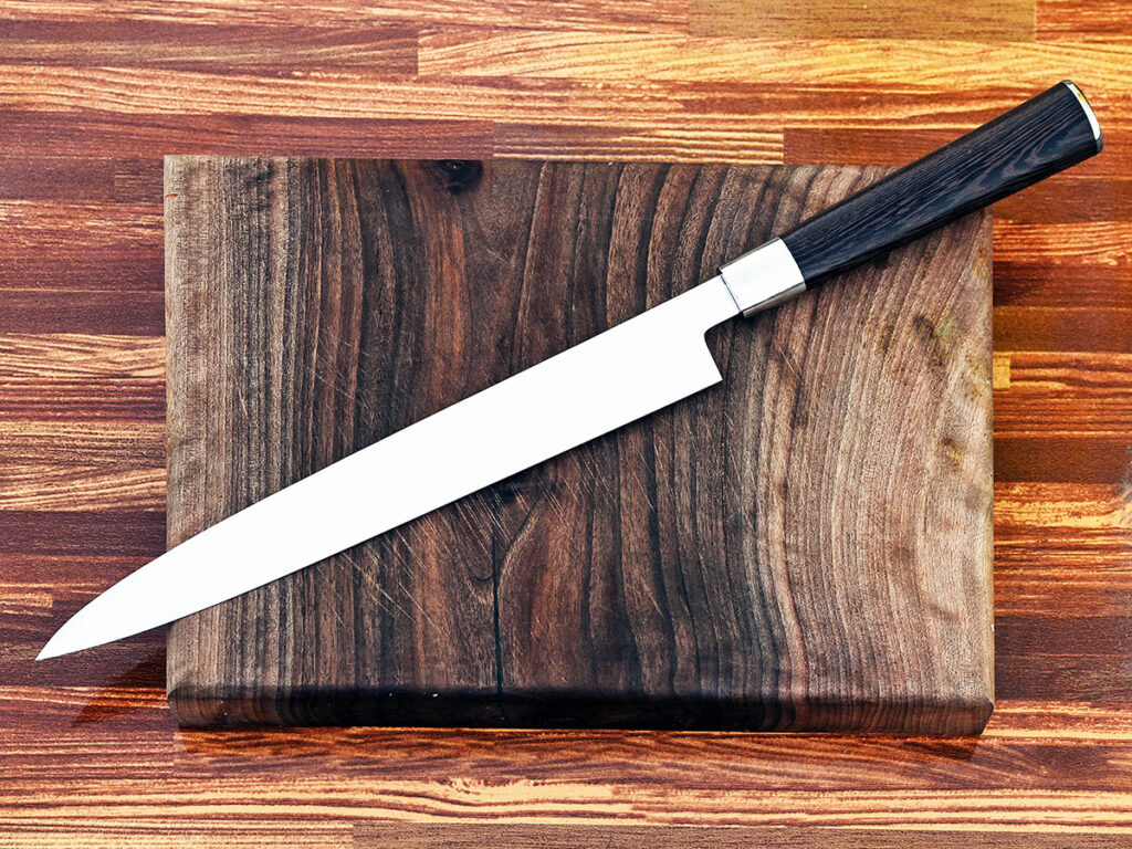 Single bevel or zero-ground knives are very popular in Japanese kitchens, especially for slicing sashimi. These knives get their name from the distinct look of having a flat side on the left-hand side of the blade to protect the chef’s fingers while slicing and dicing. Because of the lack of parasitic drag found on a conventional or Western-style kitchen knife, they excel in the kitchen regarding cutting performance.