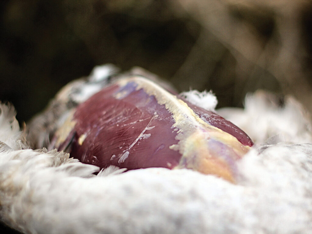 With the morning light creeping by, one of our team spoke up and said, “Guys get ready, here they come!” As I looked over my shoulder, I quickly learned he wasn’t referring to a small group like the ones we had been seeing all morning. Adrenaline surged with the realization that a huge flock of 500-plus was barreling our way. It was evident that this was the location they wanted to feed because there wasn’t any hesitation to commit. As the birds approached, swinging into view on their final pass, I could feel my heart beating out of my chest. I thought, This is it, they’re going to work right! A thousand wings thrashed the air so loudly that I couldn’t hear the person next to me.